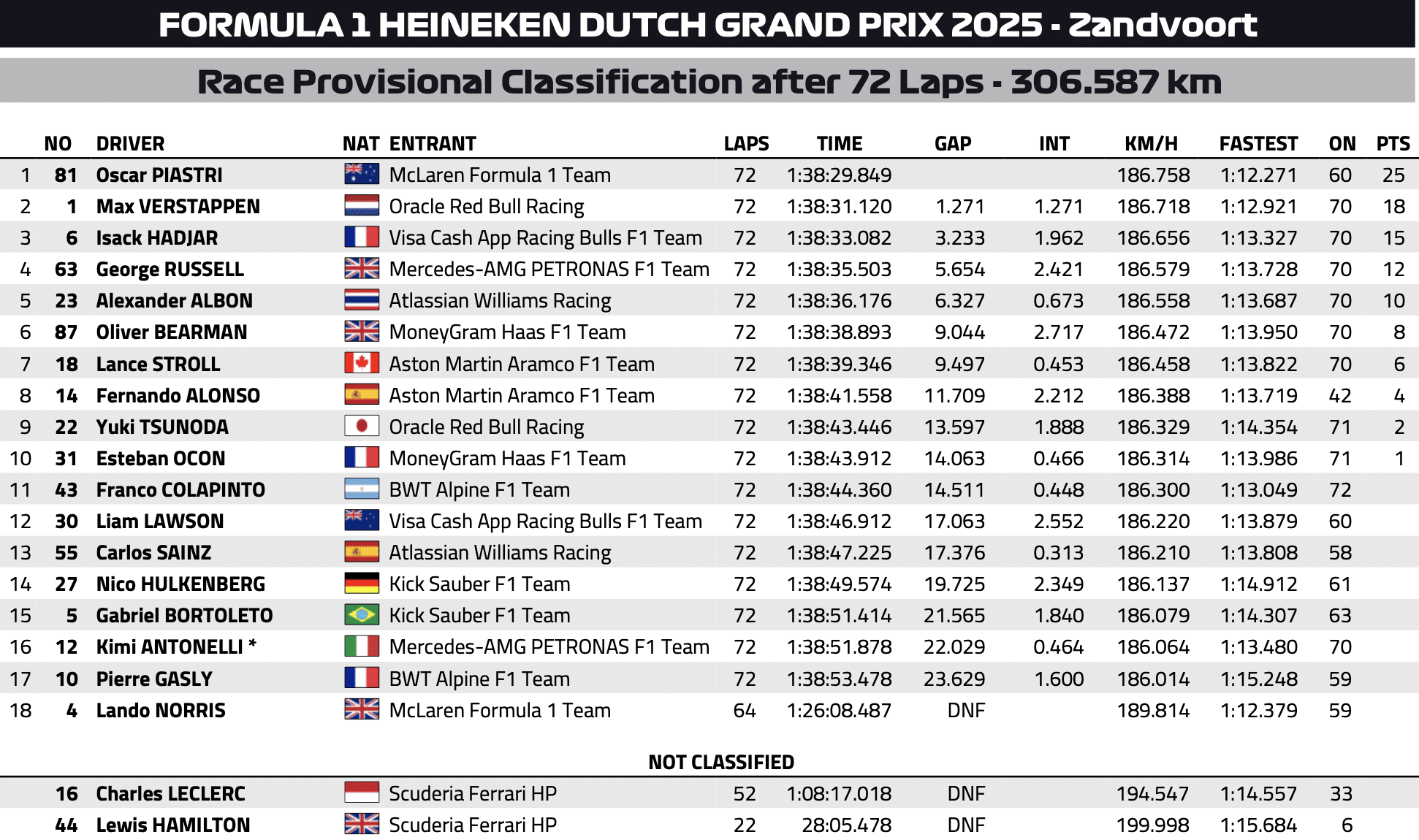 Med sig på podiet havde Oscar Piastri selskab af ingen ringere end hjemmehelten Max Verstappen og Isack Hadjar. Det er få løb siden, vi fik lov til at opleve Hülkenbergs første podie, nu har vi ligeledes fået lov til at opleve Hadjars! En podieplacering der kan vise sig at være guld værd i kampen om 5 pladsen i konstruktørmesterskabet.